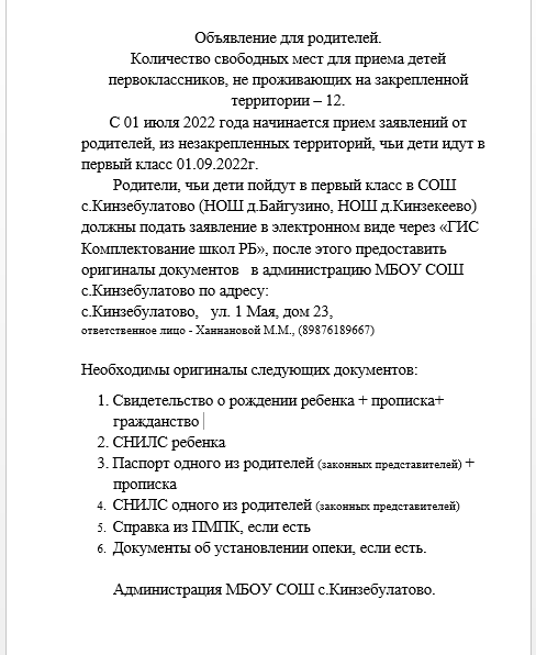 Объявление для родителей